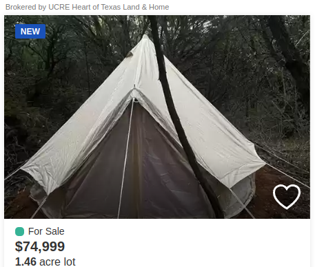 Oh gee, what a cute little tent and a scenic acreage of bramble and brush, said no one ever! What a joke! This was located nearby some piss puddle lake. I’m not completely opposed to the idea of living in a tent ever since I’ve lowered my standards (see “Glamping”), but $74K for barely even an acre is an insult! For that price, it better come with the tent included. Since this is just little over an acre of unimproved land that’s near a lake (not beside a lake), and quite possibly in a flood zone, this wouldn't be worth more than $5,000.