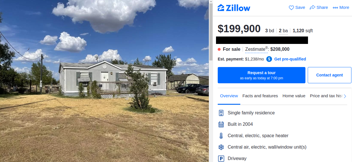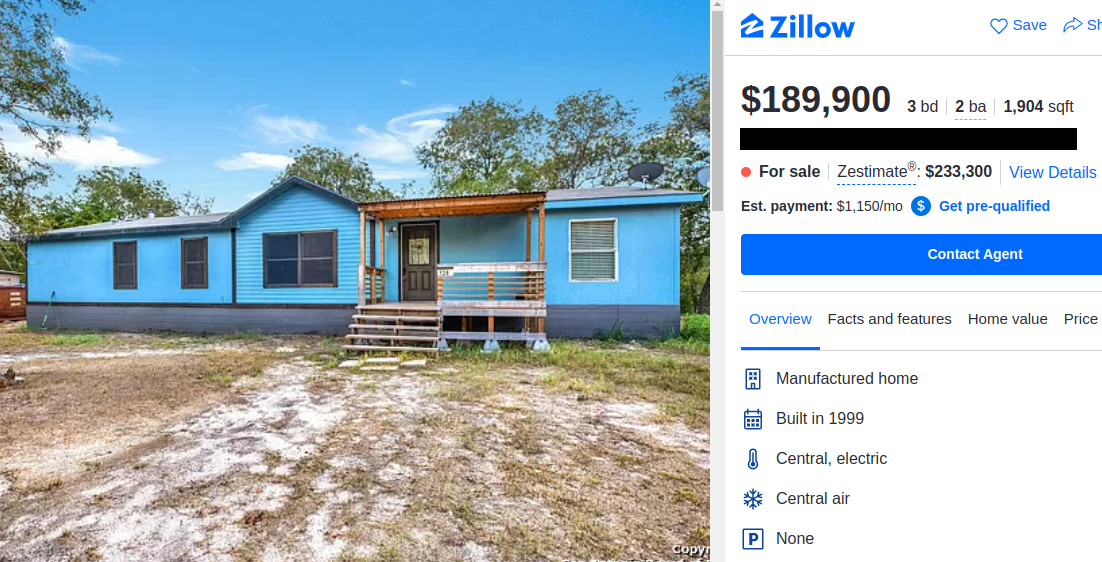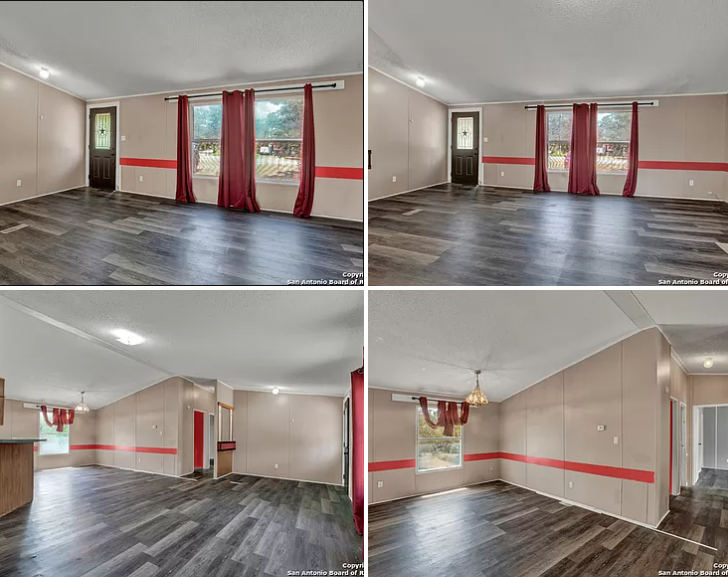 Here's another mobile home for a ridiculous price. This one is on 1 acre of land this time, but look at dat roof! It needs a new roof. The yard looks a little better here (coming from someone that's use to the dead summer lawns of Texas.) I would also be cautious of those window AC units. Most people fail to ever install a drip pan for them because they either don’t come included with the unit or they're just lazy. Years of condensation will soak into the wall and rot it out. Depending on its condition and if the roof and walls aren't dry rotted, this would be about a $50-60,000 property. If it's rotted, then I'd say $20K