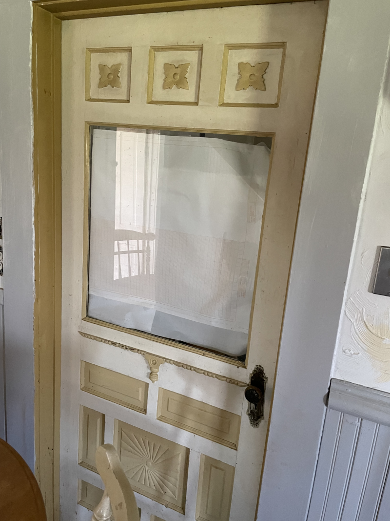 I’ve also discovered that the back utility closet of the house was once a porch, which will also need some re-working on one corner. Walking thru the house, I’ve realized that this back porch was once a front porch! Things started to make sense then. I wondered why the stairs were hidden off in the kitchen, which was actually once a formal entry. I can even see marks on the wall beside the stairs where there was once a sitting bench that would have been attached to the wall. The ornate door back here was the front door; It has always been in the same place. I figured it was moved here from the now-front porch, but no, this is where it belongs!