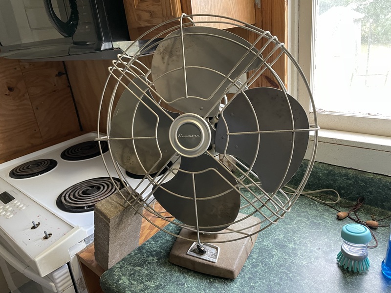 The Kenmore fan on the top-right is from some time in the late 50's to early 60's. It works pretty well, but likes to rattle on occasion. I need to get it some grease which would fix it right up and rewire it too since the current wire seems to be hanging by a thread.