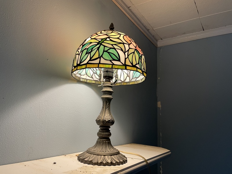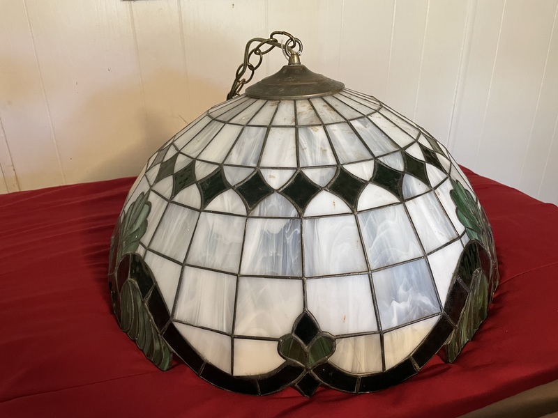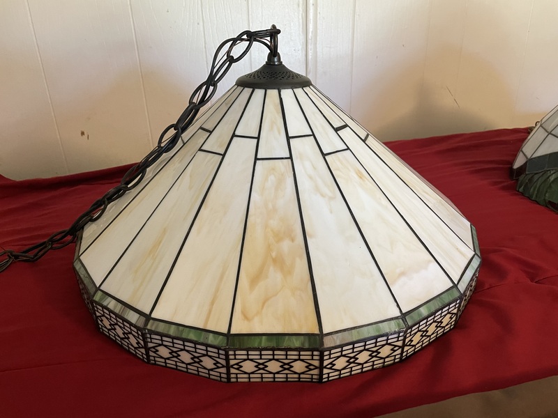 The top left lamp is an arts and crafts style that was rewired and has newer light sockets. It cost me $180. This will make a fine piece to go above the dining table, which is why I was willing to spend a little on it. The top-right lamp cost me $5, because it was cracked and broken in one place that looks easily repairable. I'll probably put it in the kitchen over the sink.