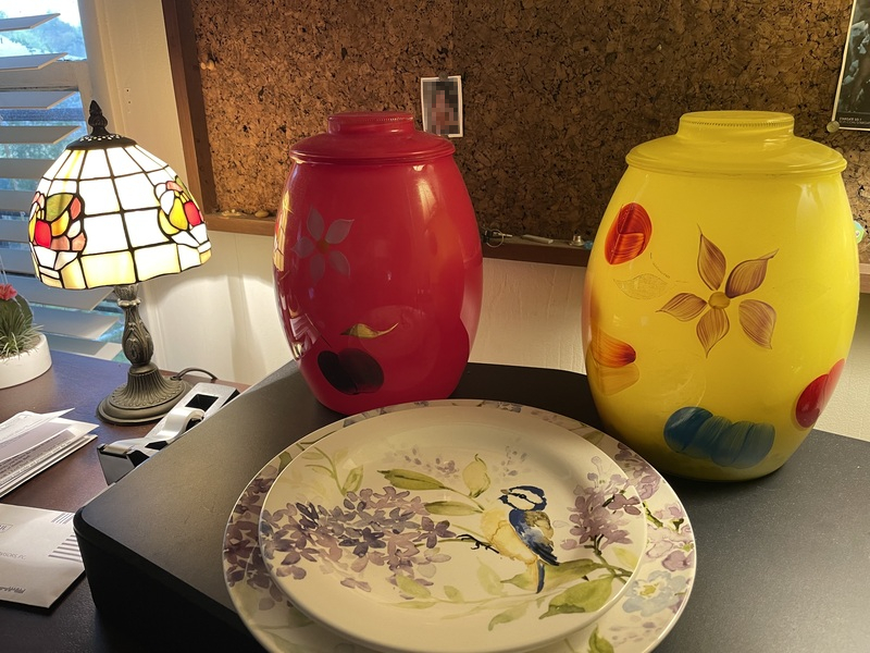 Also you may of noticed my vintage Bartlett Collins cookie jars. The yellow jar on the right is my grandmothers which has a little story to it. The red jar on the left I found at an antique mall for $10. I'll try to collect a few more of these as I find them because they would go great with my kitchen plans. If you're wondering about the two plates, I got them for $3 each at Hobby Lobby and really liked them because of the blue bird and the spring theme colors.