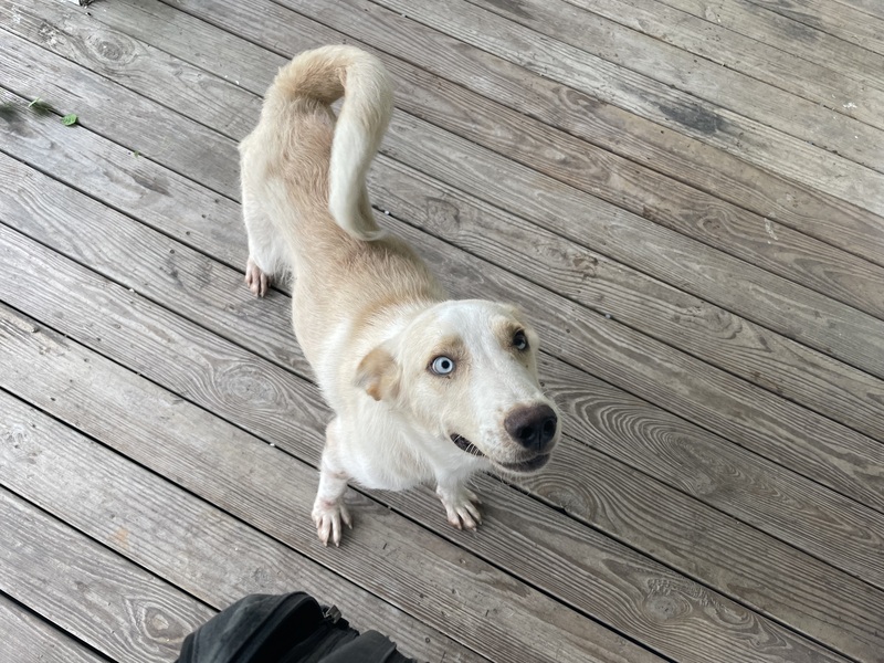 He’s been coming around since then, which I figured he would after feeding him that one time, so I got him a bag of dog food, some chew bones, and a rope toy. He sticks around now in the back yard and is a really friendly dog when not skittish. He’s a nearly all white Australian Shepherd with bright almost white blue’ish eyes, with one eye having some weird coloration deformity. Despite being young, I think he might be nearly blind because if I throw his rope toy or a stick, it just doesn’t register in his dog brain that I threw anything at all; my cats have more sense when I throw them something! I have to be really obvious, and then he’ll chase after it, but then he has completely no idea where it landed and will look around then give up.