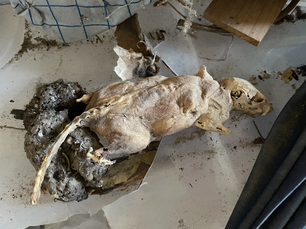 Speaking of dead things, I also found this big ass dead mummified rat in a closet. There were also a bunch of smaller mice skeletons everywhere in the closet too, go figure! I figured out how they were getting into the house too, because the morons that installed the upstairs bathroom before I ever came along cut out a huge hole in the floor of the closet to run the septic line out and didn’t cover the exposed space. That would explain why there was so much mouse and rat shit everywhere back when I got the place. They haven’t been a problem though ever since moving in, but I’m definitely going to cover that opening up.