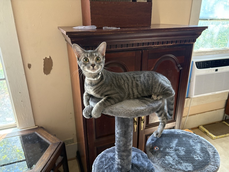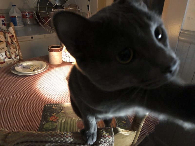 One afternoon I went to Tractor Supply to get some cat food, flea collars because somehow fleas got in the house, and heat lamp bulbs for the well house, Poochie’s new dog house (more on that later), and possibly my Outhouse too if I ever get it hooked up to power. As I was perusing thru the store, I saw on clearance a kitty cat play set for $25! It was around $100 originally, so what a steal; heck yeah I bought that too and set it up for the cats that same day! I have a picture below of KitKat posing on top its pedestal. The other one is Snickers taking a picture after totally stealing my camera.