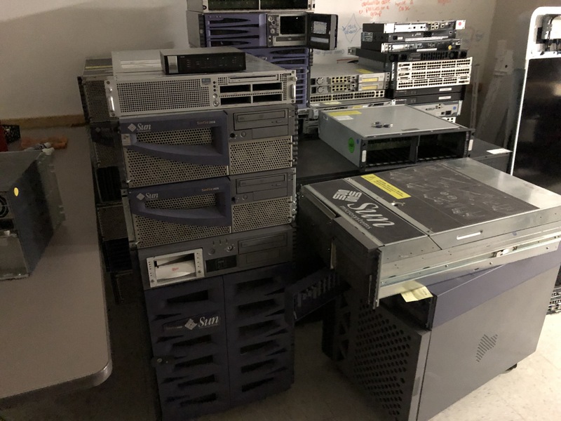 The old Sun UltraSPARC’s are so cool, I wish I could have them all, but I don’t know what I would do with them; and plus, legal department wants them destroyed! AHHH, it’s just too terrible to see because I think these have potential value for other businesses operating legacy equipment in need of spare parts. We’re also throwing out some rather new Cisco enterprise networking equipment (not seen in picture) worth more in total than the value of my property. I have a few pictures below of the crime scene, albeit some of this stuff is so old that it’s only value would be in a computer history museum.